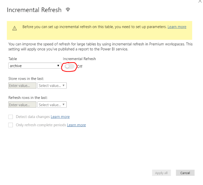 The whole idea of incremental refresh is superb: Steps here describe enabling large datasets for a new model published to the service. Setting incremental refresh adds parameters to the dataflow to specify the date range.